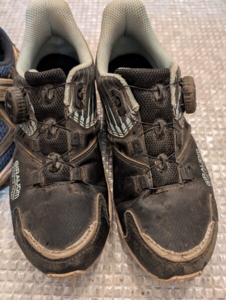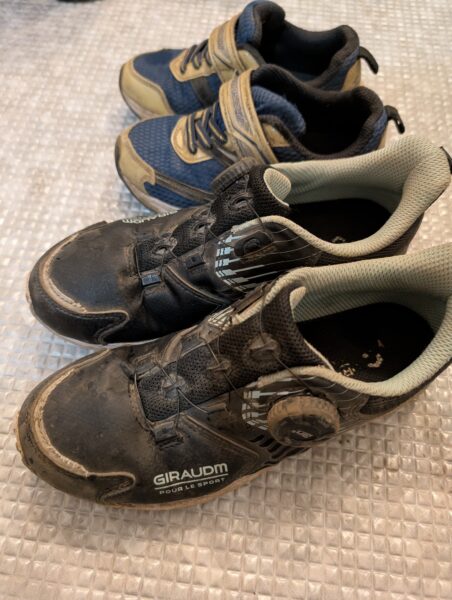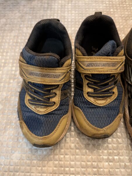①まずは洗う前の子ども二人のスニーカーです。見事に泥だらけになっています。